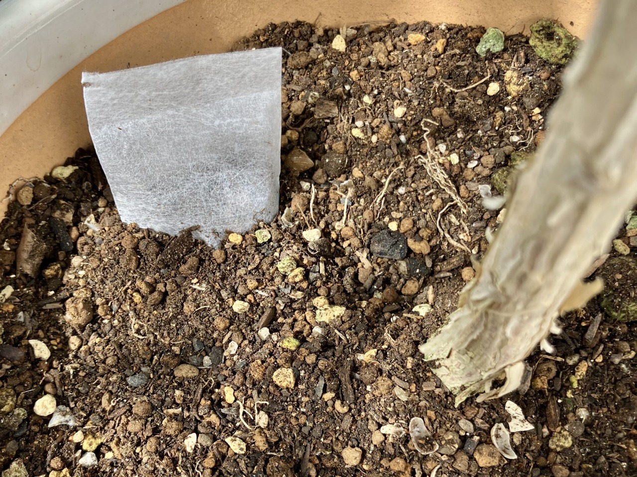 肥料バッグをひとつつまんで鉢の土に半分埋めたり、マルチング材の下に隠したり、目立たないとこに置いておけばOK!