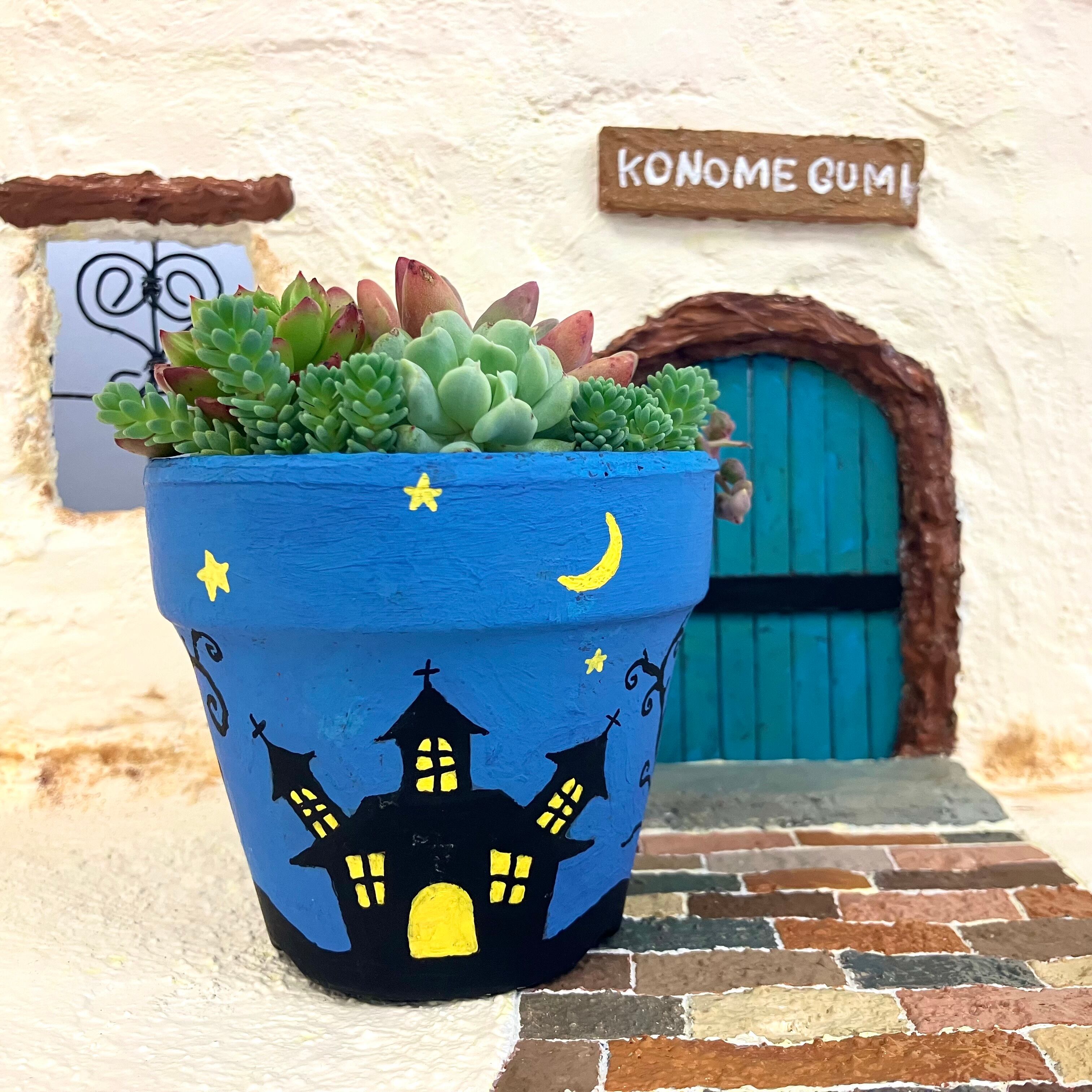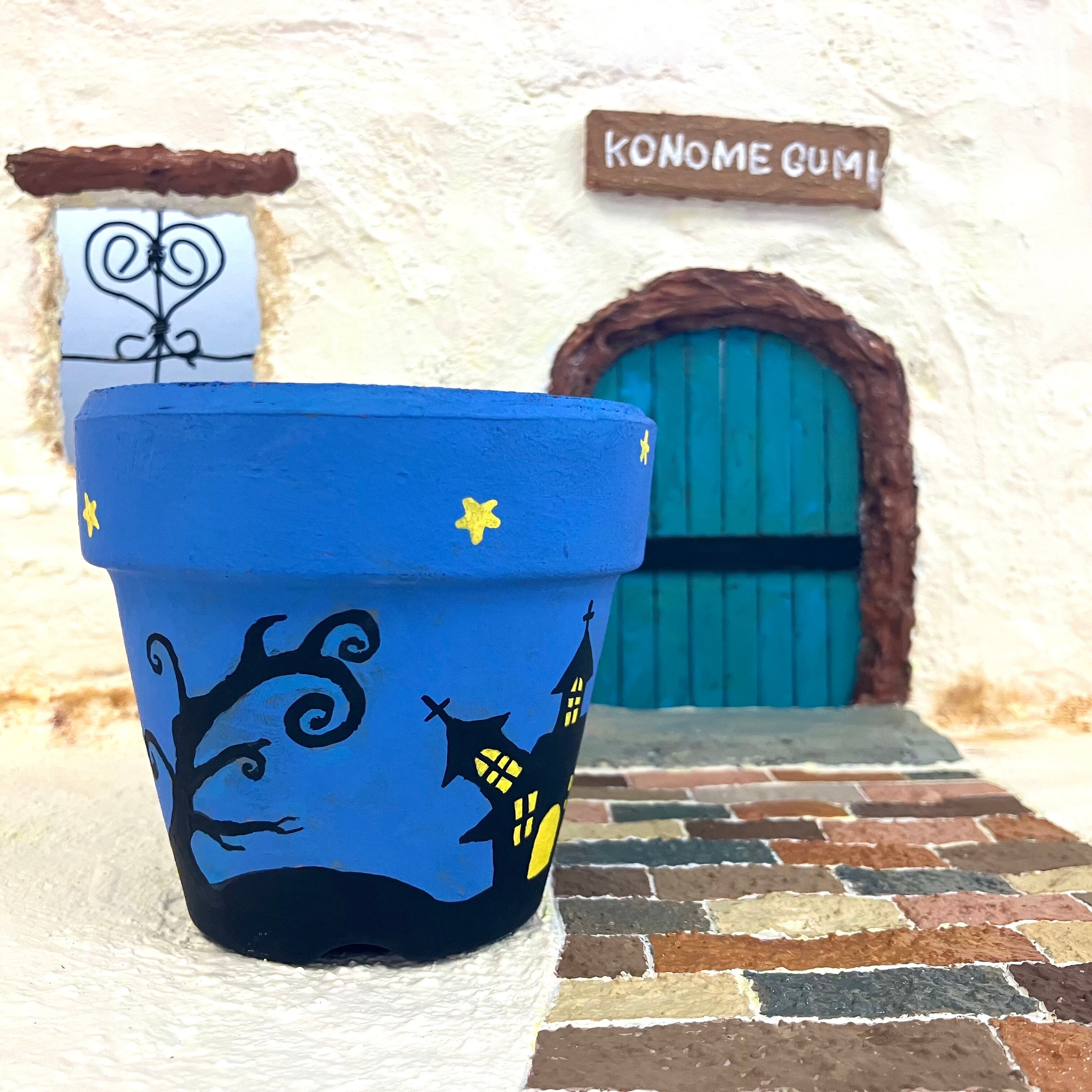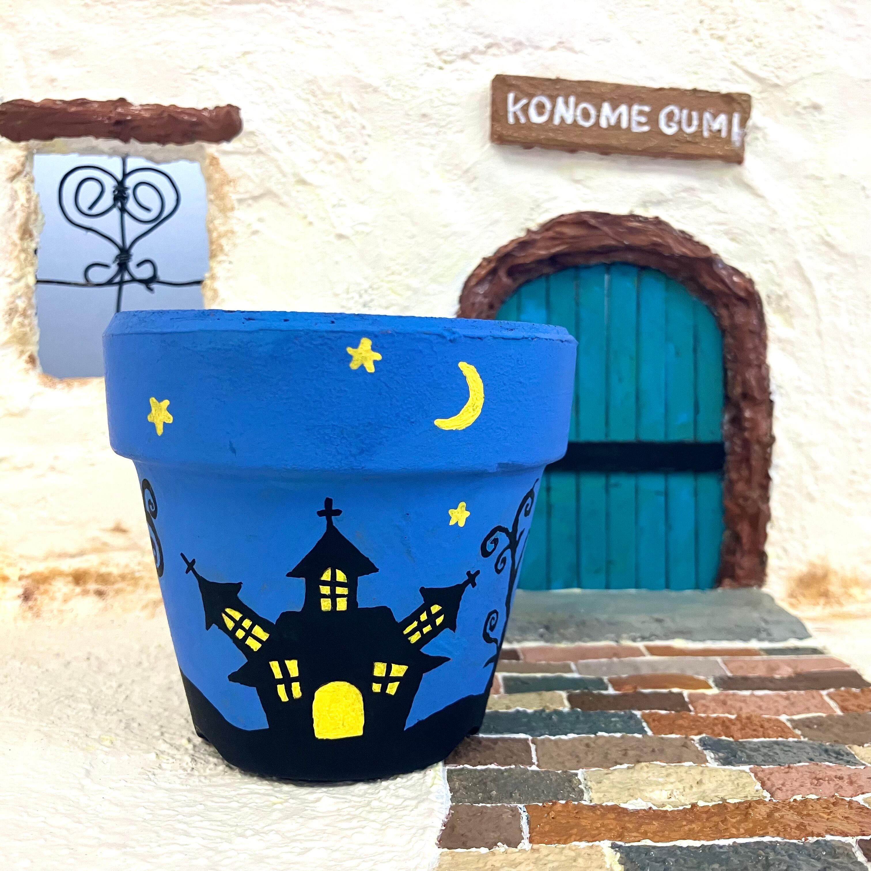 手描きで仕上げた【お城のシルエット】モチーフのリメイク鉢です。