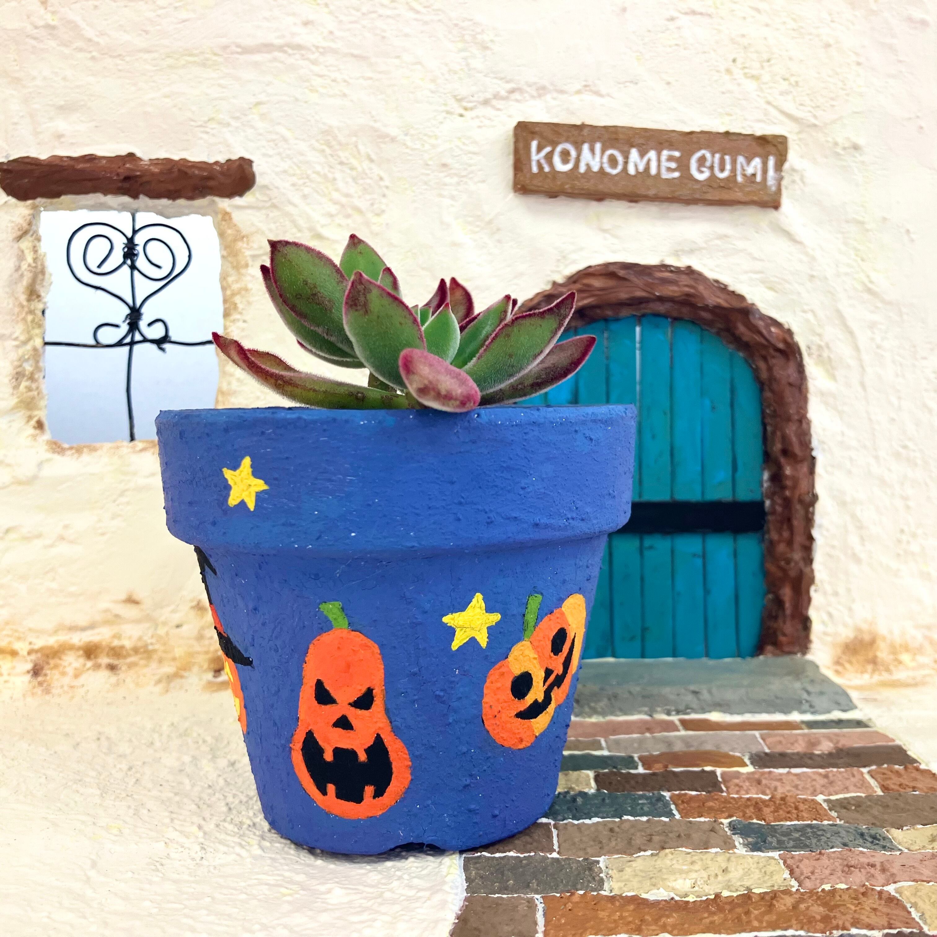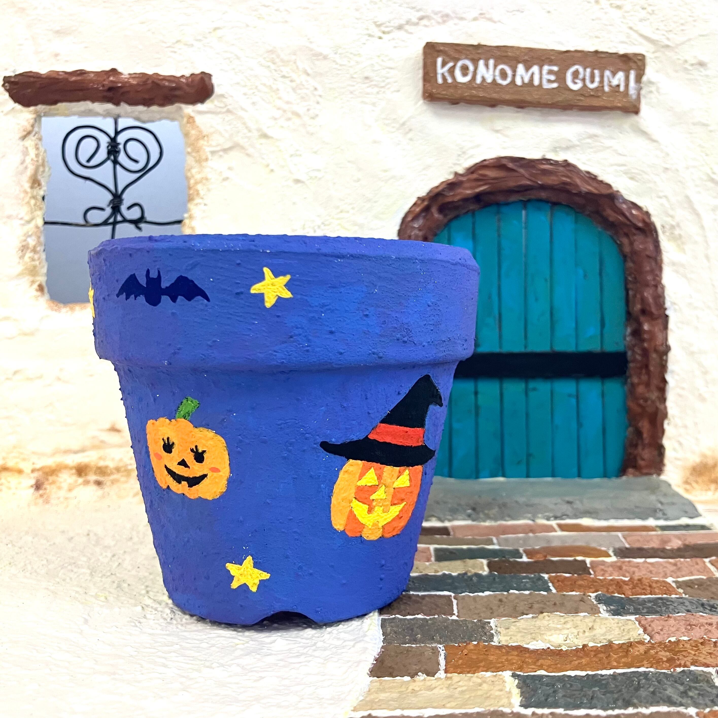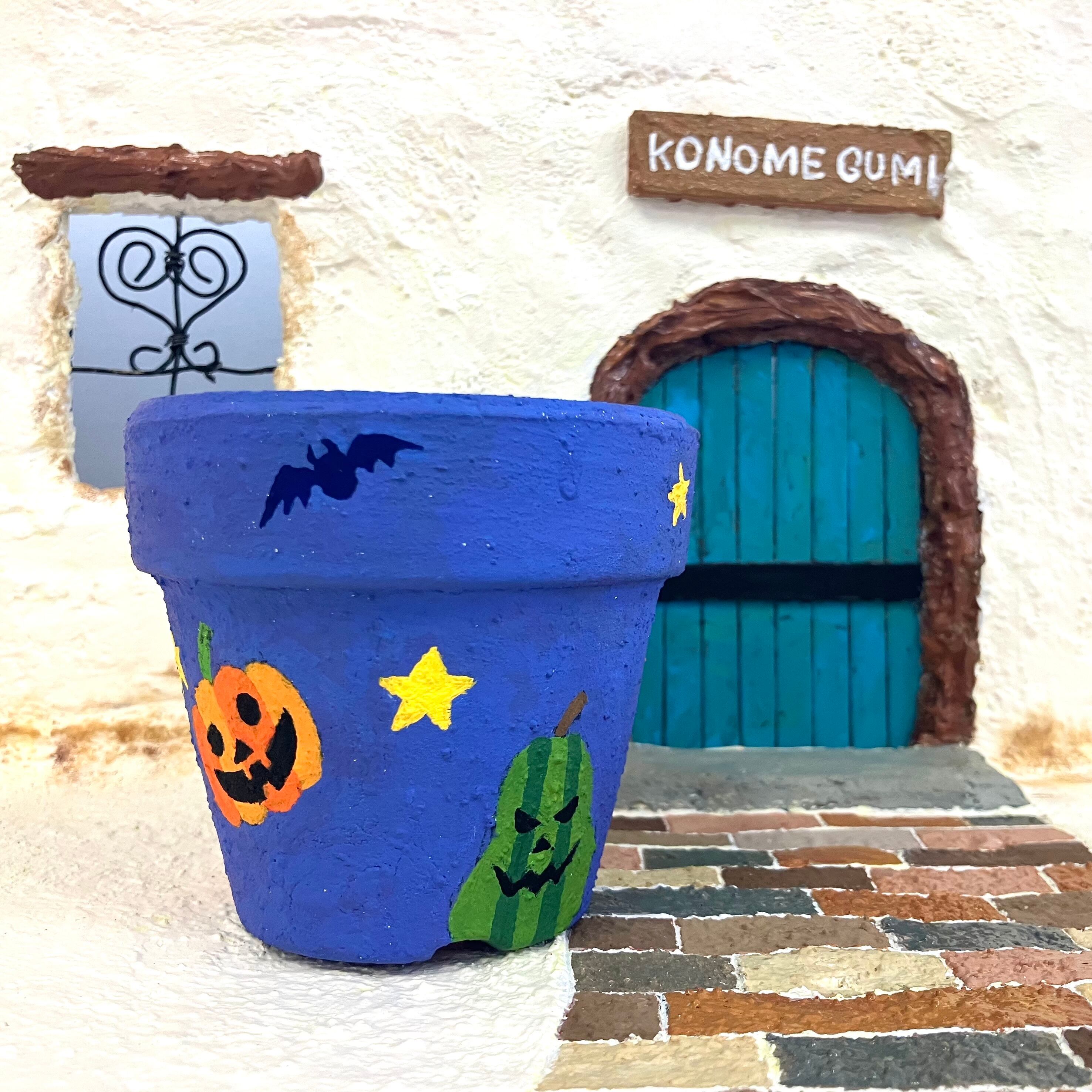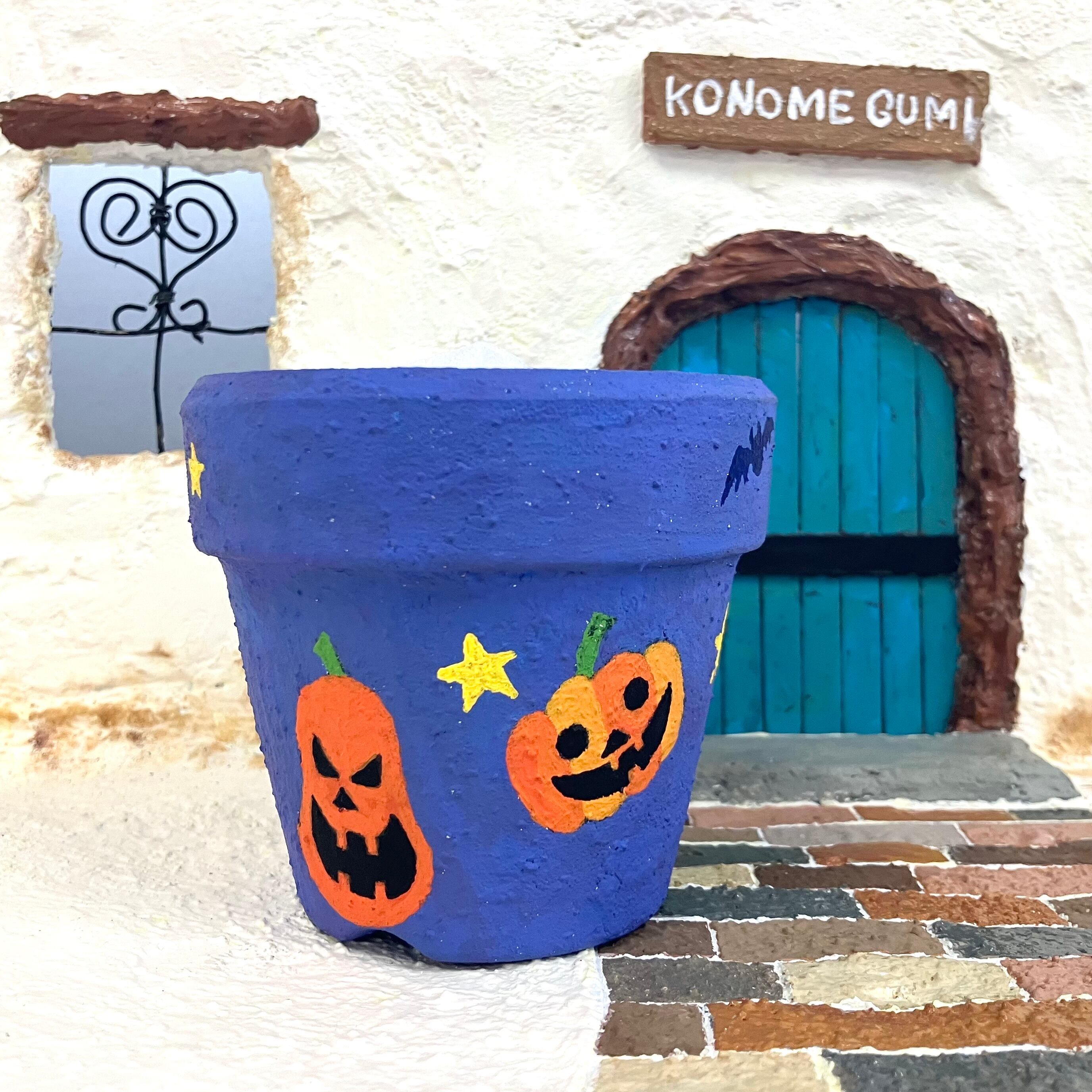 手描きで仕上げた【ジャックオーランタン】モチーフのリメイク鉢です。